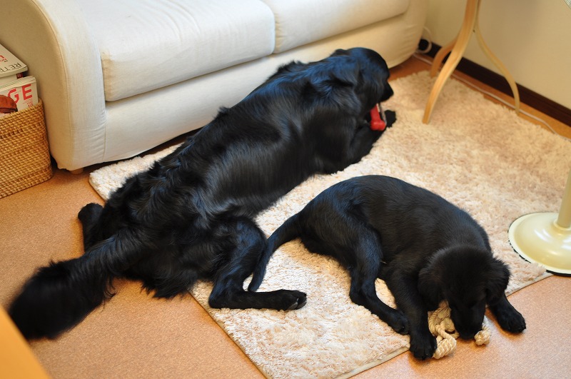 オーナーさんご夫妻のフラット、カールくんとヴィクトリアちゃんも一緒に来ていたので、一頭ずつあがって頂いて(ぜひ二頭一緒に!とお願いしてみたものの、我が家の狭いリビングには一頭ずつがやっとだったかも...。)、ケイトを我が家に慣らしつつ、先輩犬との戯れっぷりにしばし目を細めていた。