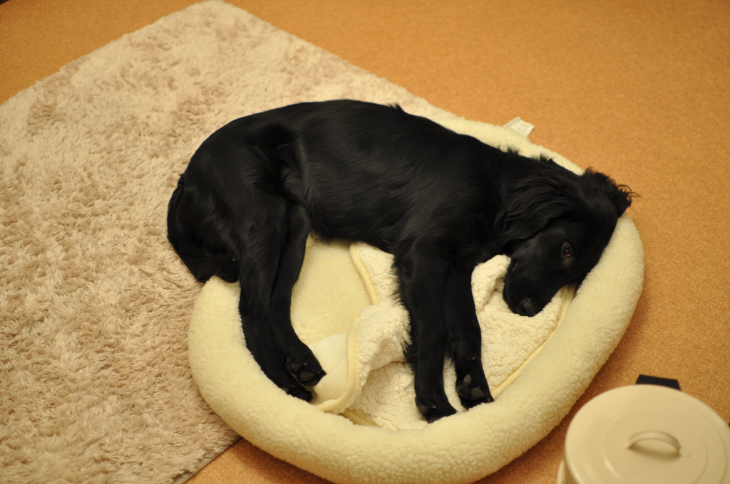 手触りが凄く柔らかで、自分で使っちゃおうかと思ったくらい快適な毛布を敷いて、すっかりくつろいでいるケイト。気に入ったかい?
